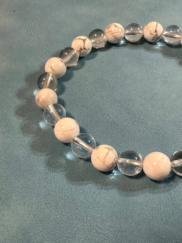 Dieses hochwertige Herrenarmband aus Bergkristall- und Magnesit-Perlen vereint stilvolles Design mit der zeitlosen Bedeutung zweier kraftvoller Natursteine.